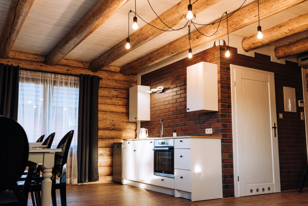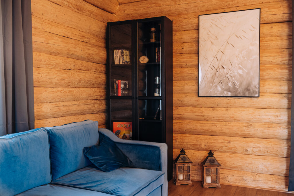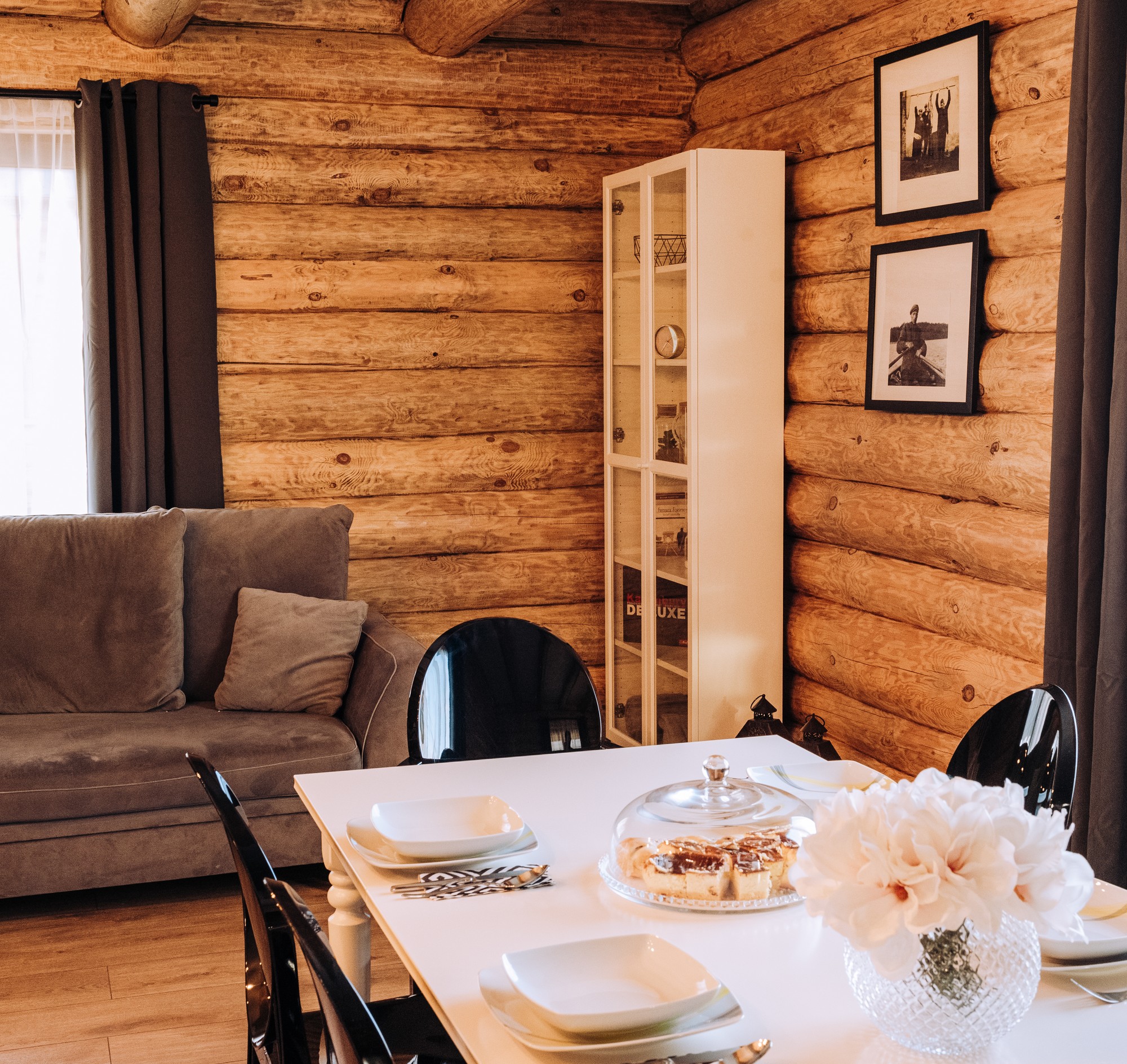 Najbardziej klimatyczny drewniany dom znajdujący się w okolicy. Z zewnątrz pozornie taki sam jak każdy inny, lecz jego wnętrze zdecydowanie odróżnia się od innych. Drewniane lekko zsiniałe bele ścian nawiązują do koloru rybackich sieci, a biały sufit oraz elementy wyposażenia kojarzą się z kolorem mew, których nie brakuje wokół jeziora.